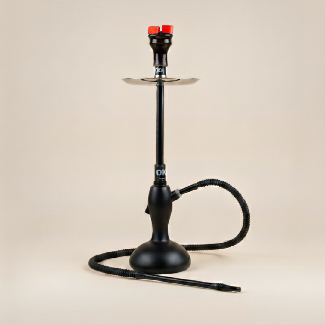 شيشة الأوكا (OKA) بتاعت التبغ الأسود دي فيها عامود دخان (أو "الماسورة") طويل مخصوص عشان يبرّد الدخان كويس وإنت بتشرب التبغ السخن. العمود الطويل ده بيخلي طعم الشيشة أحلى والسحب أنعم، وده بيديك تجربة أحسن وأريح.